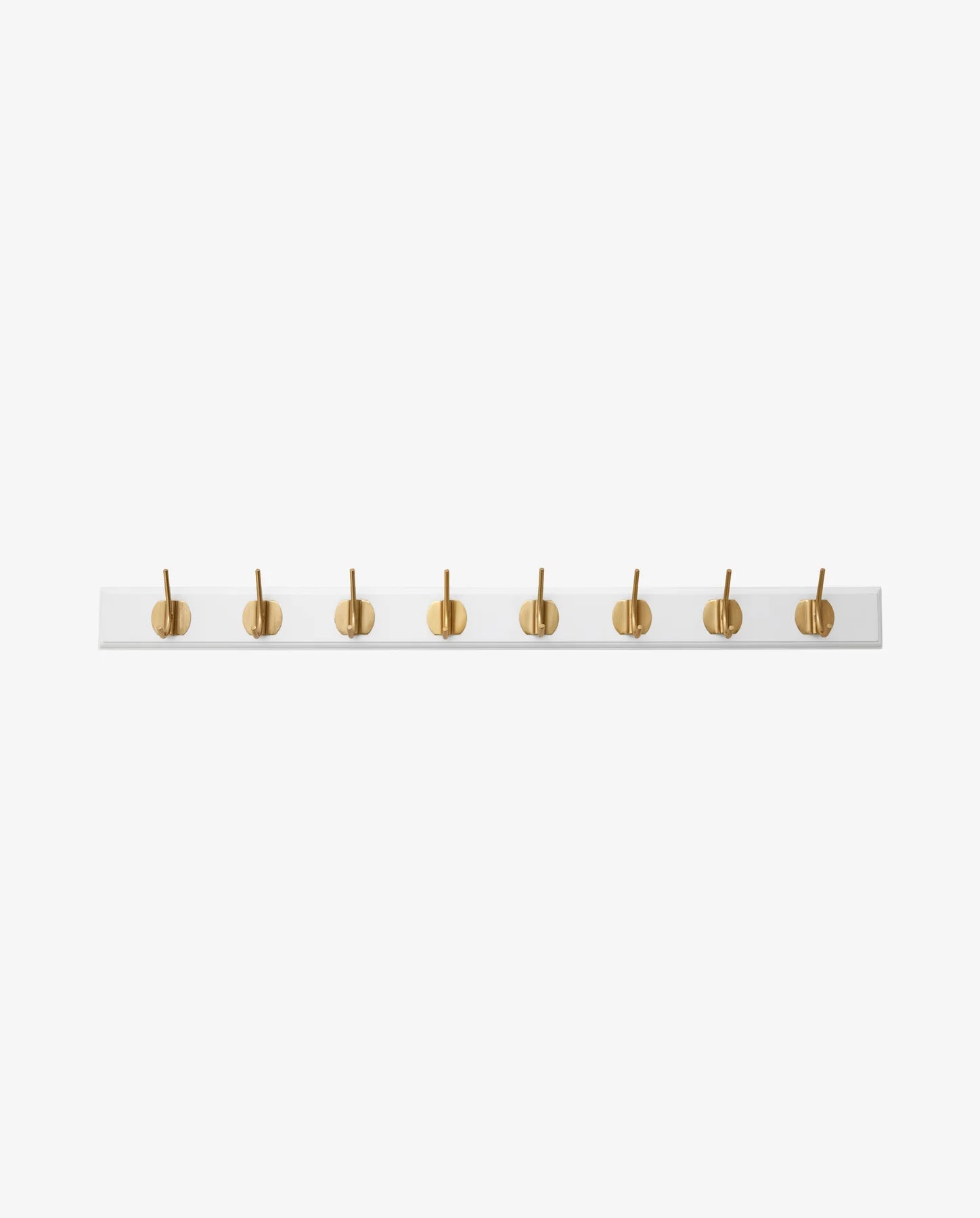 EDGY knagerække i træ med messing knager. Flot hvid knagerække med fine messing knager på et profileret træbrædt. En praktisk knagerække med et elegant og eksklusivt look. Kan både bruges til jakker i entrén eller til pyntegenstande.