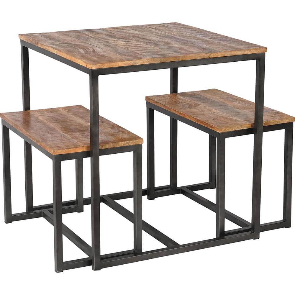 Mojito bord-bænkesæt kombinerer funktionalitet med æstetik. Med sin bordplade i rustikt genanvendt træ og mørkt jernunderstel tilføjer det varme og karakter til dit hjem. Dette kompakte sæt er ideelt til små rum, hvor det kan skabe en stemningsfuld spiseplads med kant.