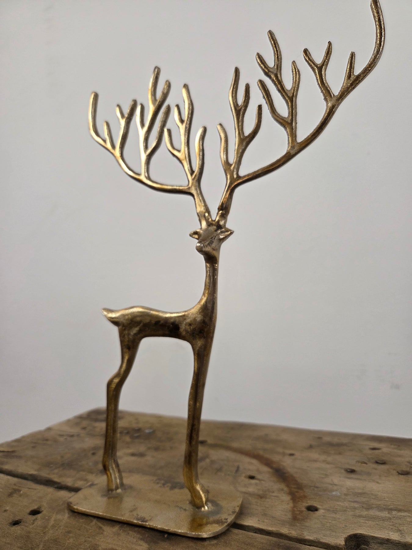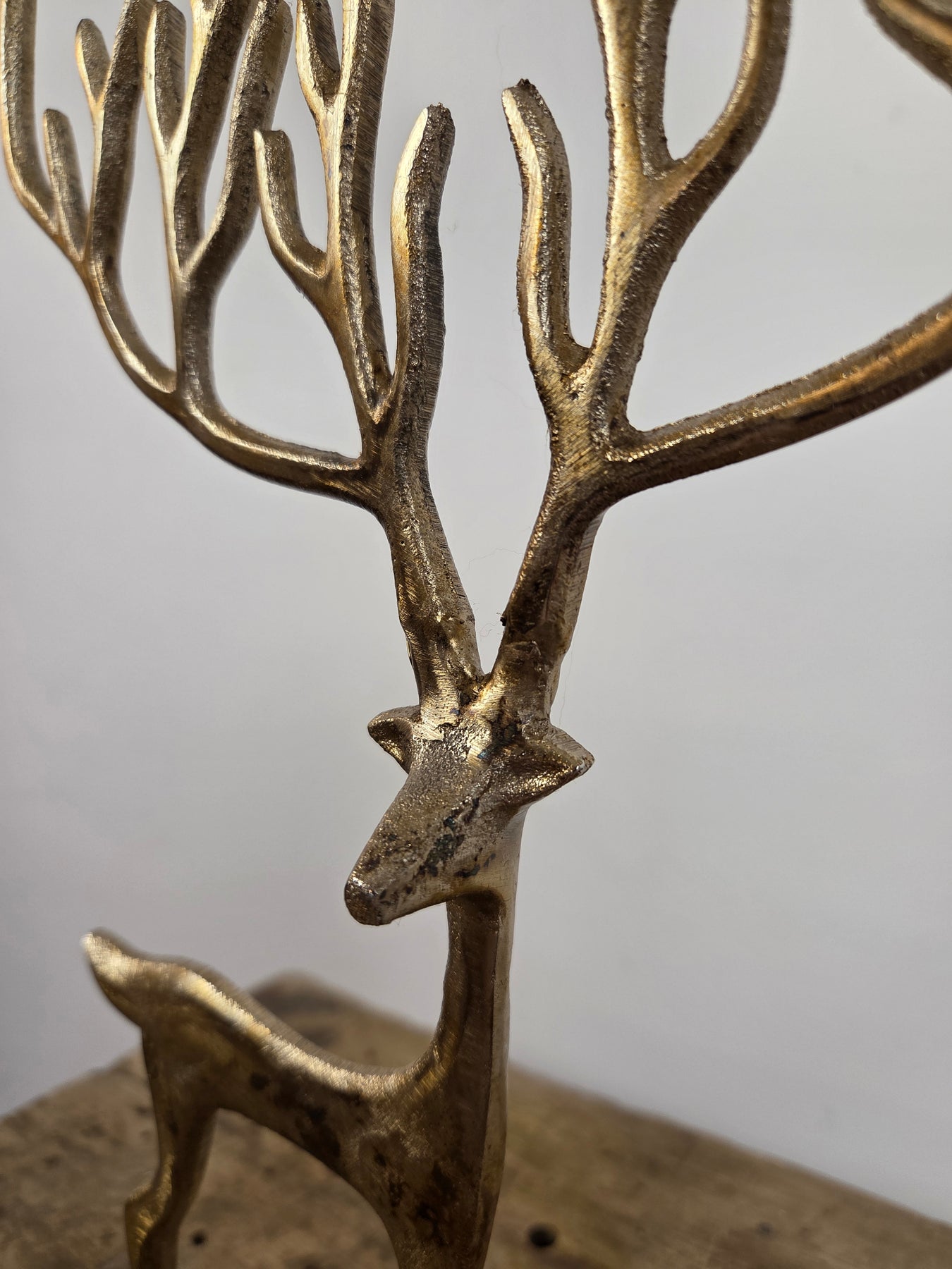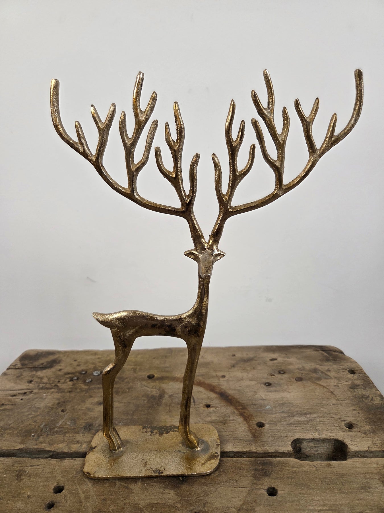 Dette smukke jule rensdyr i metal er 35 cm høj og prydet med en guldbelagt finish, der tilføjer en luksuriøs glød til din juleindretning. Med sin elegante og tidløse design er den perfekt til at pynte op på bordet, hylden eller som centerpiece i stuen.