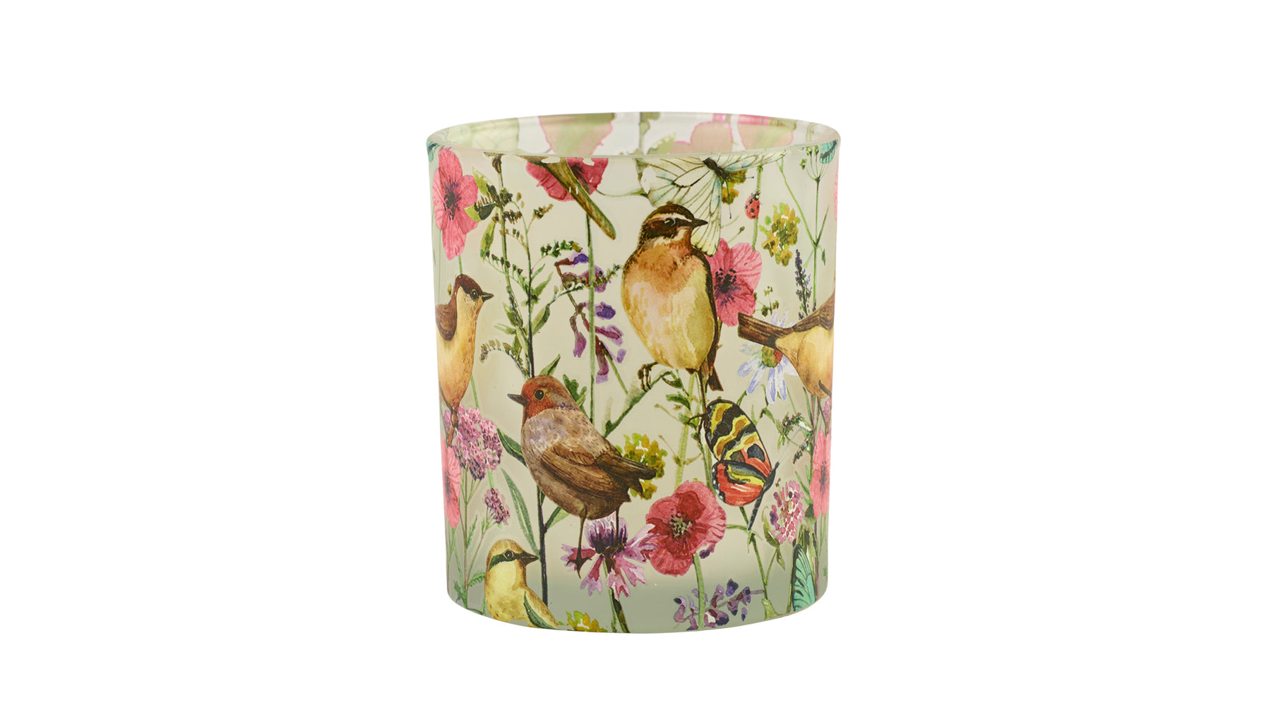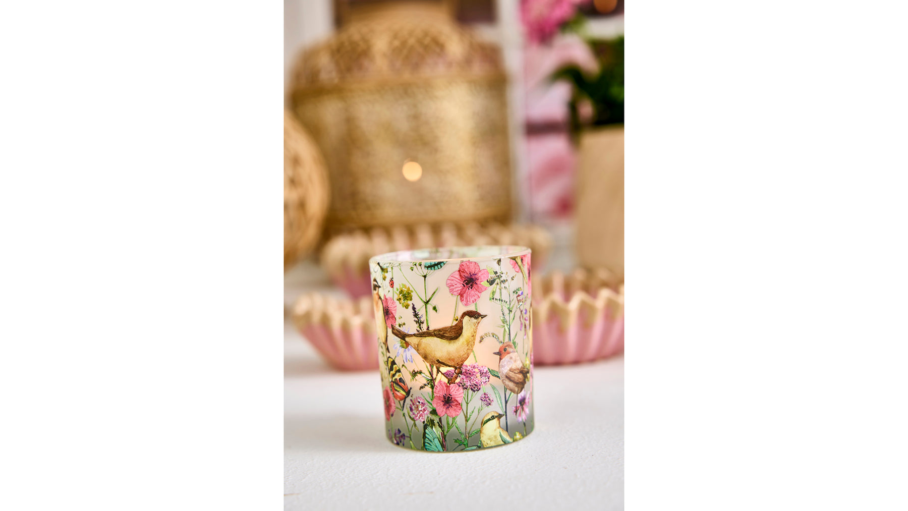 Skab en varm og romantisk stemning med denne smukke fyrfadsstage i glas med dekorativt fugle- og blomsterprint. Det detaljerede mønster i bløde farver giver et levende og hyggeligt udtryk, som bliver ekstra smukt, når lyset tændes og skinner gennem glasset.