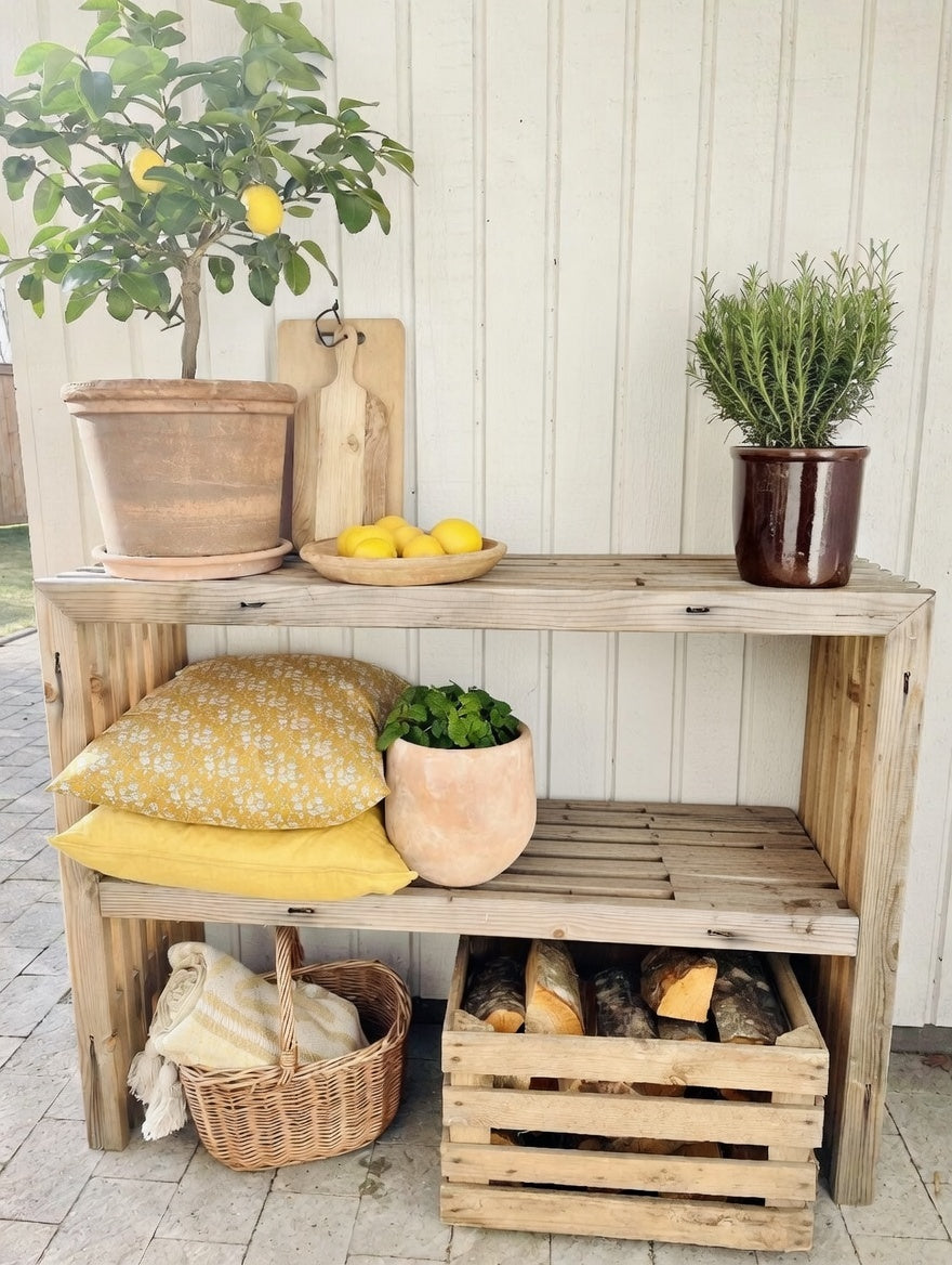 Nya vagnar: Även nya vagnar kan ha knoppar, åsar, mindre skåror eller tryck, eftersom de i grunden är tillverkade för byggbranschen. Vi tror att detta ger möblerna kant och charm. Möblerna kan slipa om med en bit sandpapper om du vill ha en helt slät finish. Tegelstenar kan falla ut med åren.