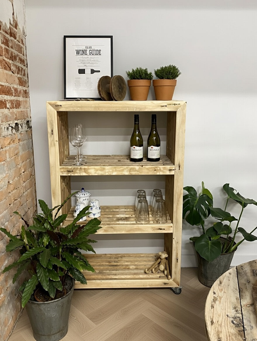 Praktisk liten bokhylla på hjul för användning i köket, vardagsrummet, badrummet eller på terrassen.