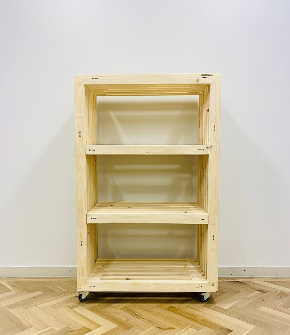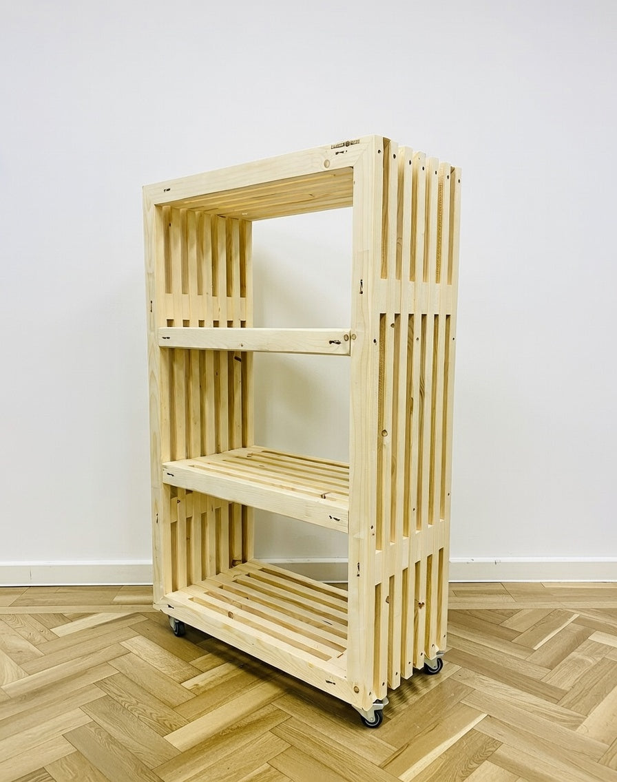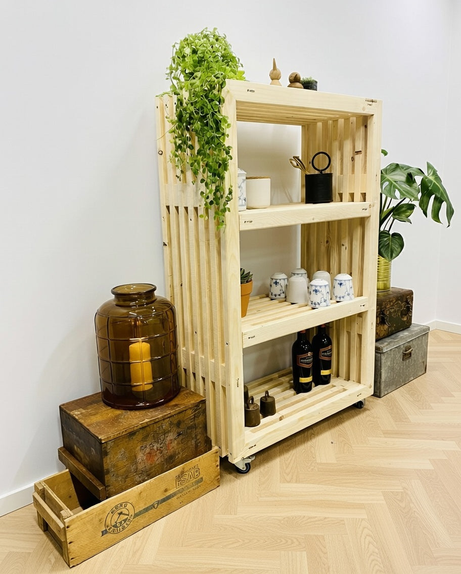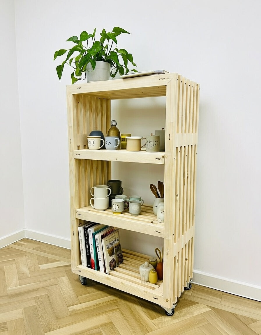 Praktisk liten bokhylla på hjul för användning i köket, vardagsrummet, badrummet eller på terrassen.