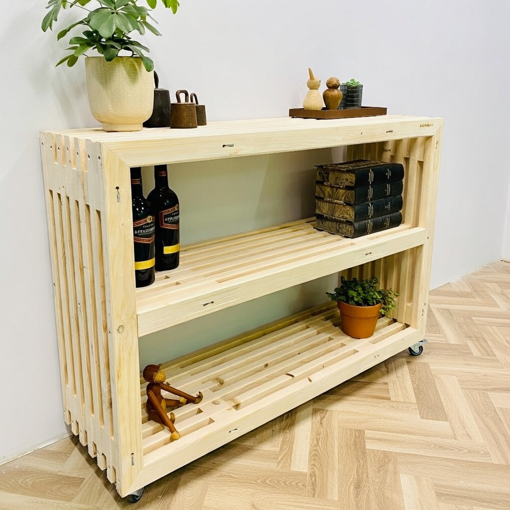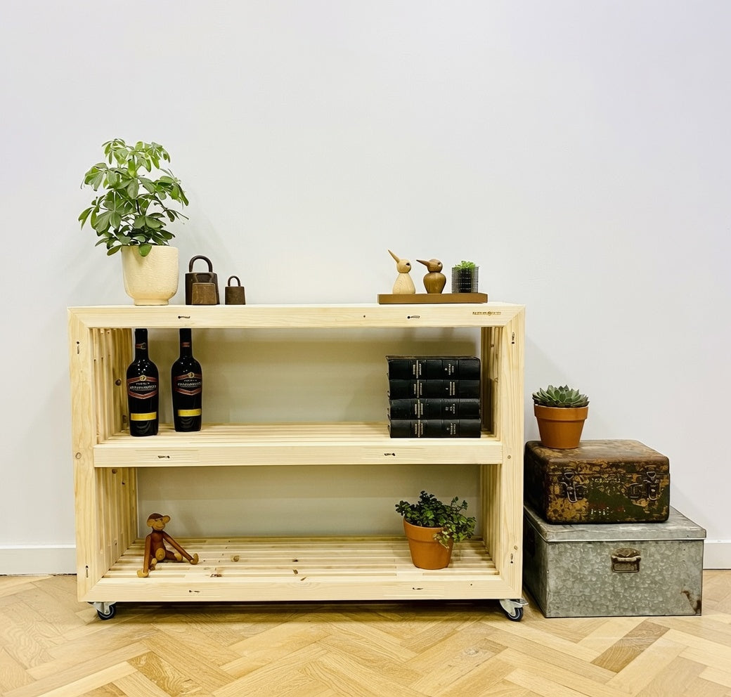 Vacker och praktisk bokhylla på hjul. Bokhyllan är byggd på vagnar och är idealisk att använda som bokhylla, rumsavdelare eller ev. bar - Bara fantasin sätter gränserna.