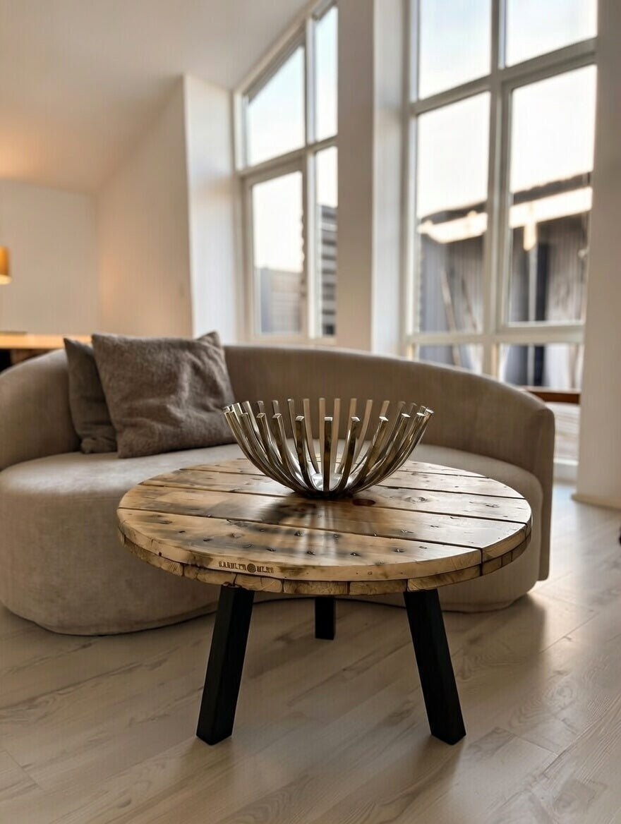 Våra soffbord av kabeltrumsplattor ger ett rått och industriellt utseende som passar bra till den nordiska stilen och inredningen. Den runda formen gör bordet perfekt för hörnsoffor eller U-soffor.