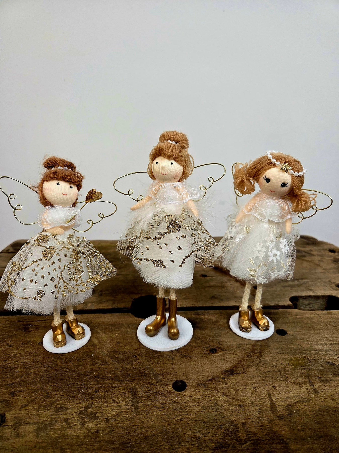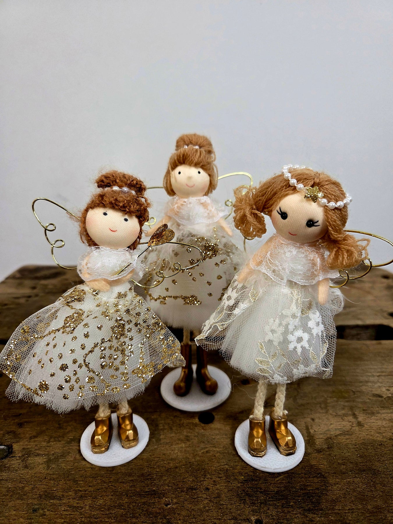 Disse fortryllende julefeer er det perfekte pynt til at tilføje en magisk og eventyrlig stemning til dit juletræ eller hjem. Håndlavet med fine detaljer som blødt stof i ansigt og kjole, krøllet garnhår i brunlige toner, gyldne wire-vinger og en lille tryllestav med glitterstjerne, der giver et sødt og drømmende udtryk. Kjolerne er i lette, gennemsigtige materialer som tyl og blonde med glimmeraccents i nuancer af hvid og guld, der fanger lyset smukt. Med en hængesnor er de nemt at ophænge på træet, i vinduet eller som en del af en større dekoration – sættet inkluderer flere varianter for en varieret og charmerende samling. Ca. 10-15 cm høje, er de ideelle til både traditionel og romantisk julindretning, og vil bringe smil og fantasi ind i højtiden år efter år!