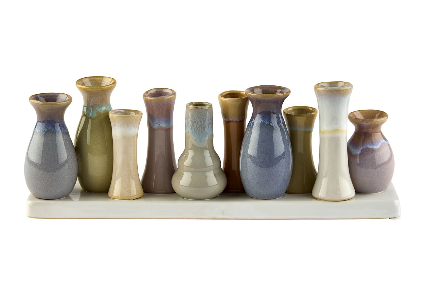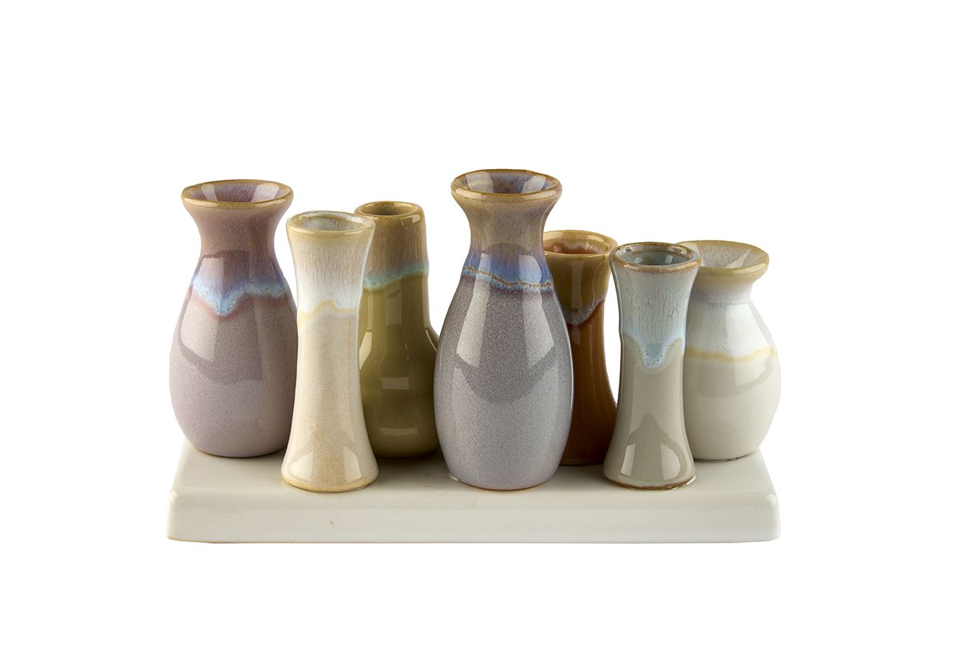 Disse små vaser i keramik er en smuk og harmonisk måde at samle flere blomster eller grene på samme tid. De består af otte forskellige former – fra slanke flasker til bløde buede og åbne tragte – der står tæt samlet på en rektangulær base. Glasuren i bløde, organiske jord- og pastelfarver med fine overgange i blågrå, beige, brun, lavender og cremet nuancer giver et naturligt, næsten flydende udtryk, der passer perfekt til nordisk, minimalistisk eller boheme-inspireret indretning.