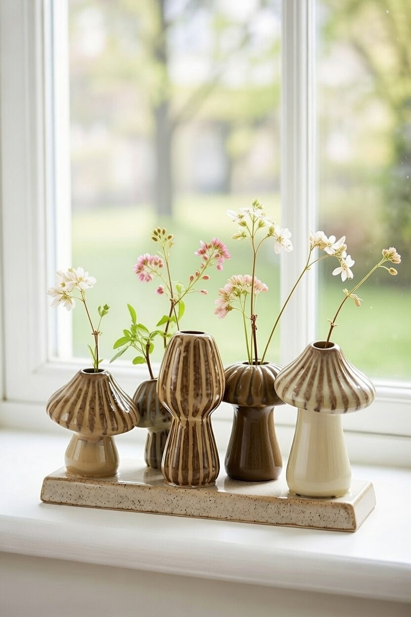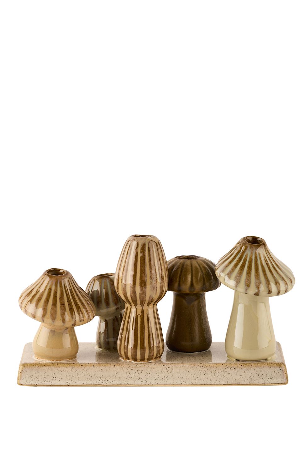 Disse små svampevaser i keramik er en fin og legende detalje, der bringer lidt natur og hygge ind i hjemmet. De fem forskellige svampeformer står samlet på en rektangulær base med let ru overflade, og de har en naturlig, håndlavet glasur i bløde jordfarver – fra dyb brun og beige til cremet lysebrun med striber og dryp-effekter. Formen minder om rigtige svampe med buede hatte og korte stokke, hvilket giver et organisk og charmerende udtryk.