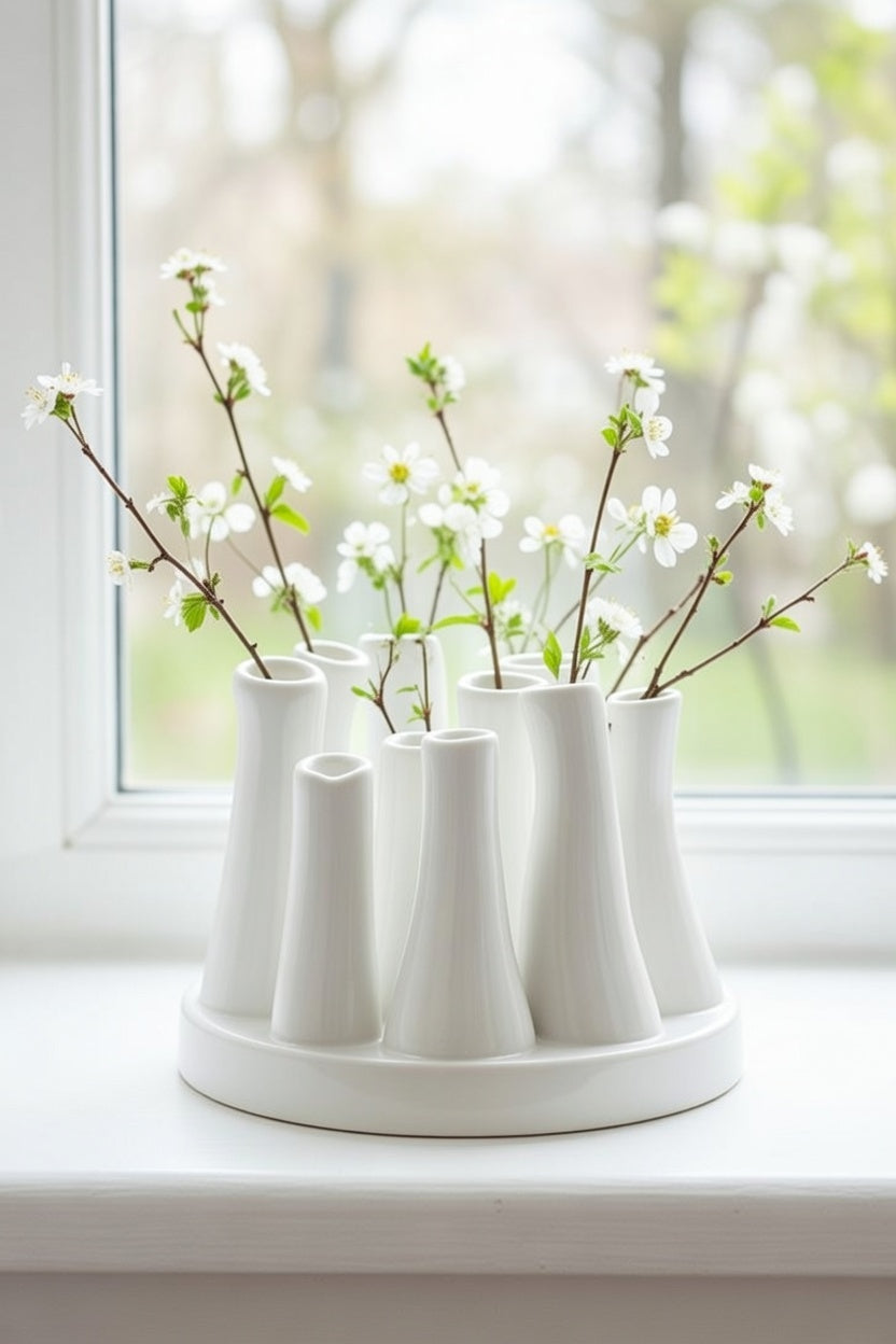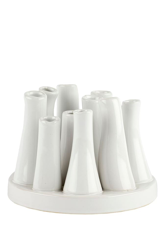 Disse små hvide vaser i keramik er en enkel og stilren måde at skabe lidt ro og harmoni på bordet eller i vindueskarmen. De ni slanke, kegleformede vaser står tæt samlet i en cirkel på en rund base, hvilket giver et organisk og næsten blomsteragtigt udtryk – selv når de står tomme. Den rene hvide glasur giver et klassisk, tidløst look, der passer perfekt til skandinavisk minimalisme, nordisk hygge eller moderne indretning.