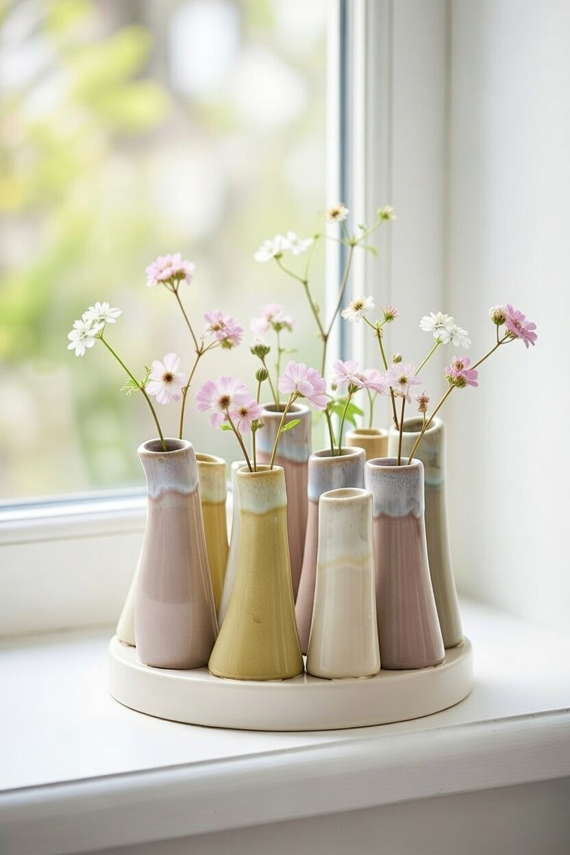 Disse små vaser i keramik er en fin og afdæmpet måde at bringe lidt organisk hygge ind i hjemmet. De står samlet på en rund base og har hver deres unikke, glaserede overflade i bløde jordfarver – fra varme beige og taupe til støvede rosa, gyldne toner og sarte blågrå nuancer. De let buede, kegleformede vaser giver et naturligt, håndlavet udtryk, der passer perfekt til både minimalistisk og nordisk indretning.